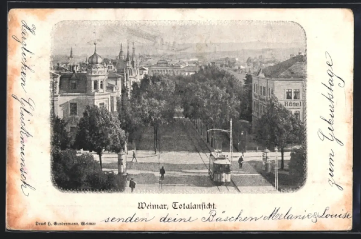 AK Weimar, Totalansicht mit Strassenbahn