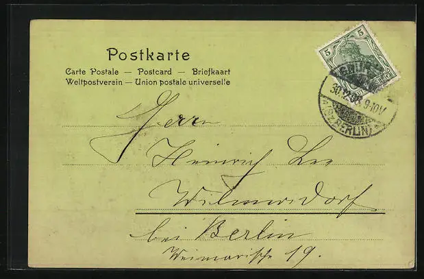 Personenbezogene Daten auf der Rückseite der Karte wurden durch blauen Textmarker unkenntlich gemacht. Die blauen Stellen sind auf die Vorderseite durchgeweicht und wirken sich negativ auf das Postkartenfoto aus