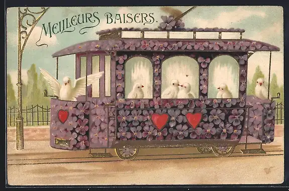 AK Weisse Tauben fahren in einer Strassenbahn aus Veilchen