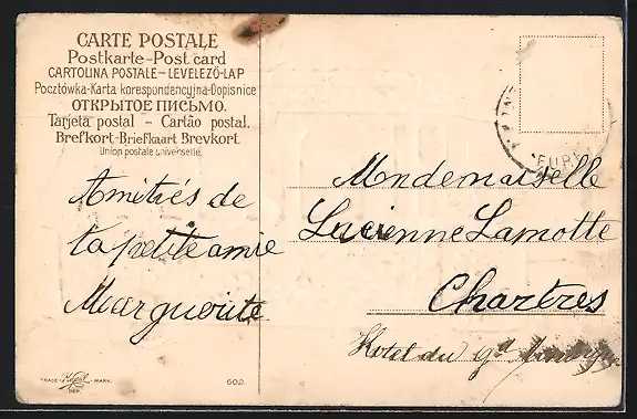 alte Ansichtskarte, gelaufen, Briefmarke entfernt, Bugspur oben, Eckknick unten re., guter Zustand