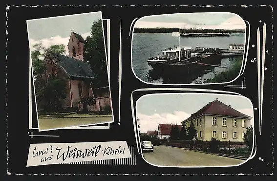AK Weisweil /Rhein, Kirche, Strassenpartie, Uferpartie mit Booten
