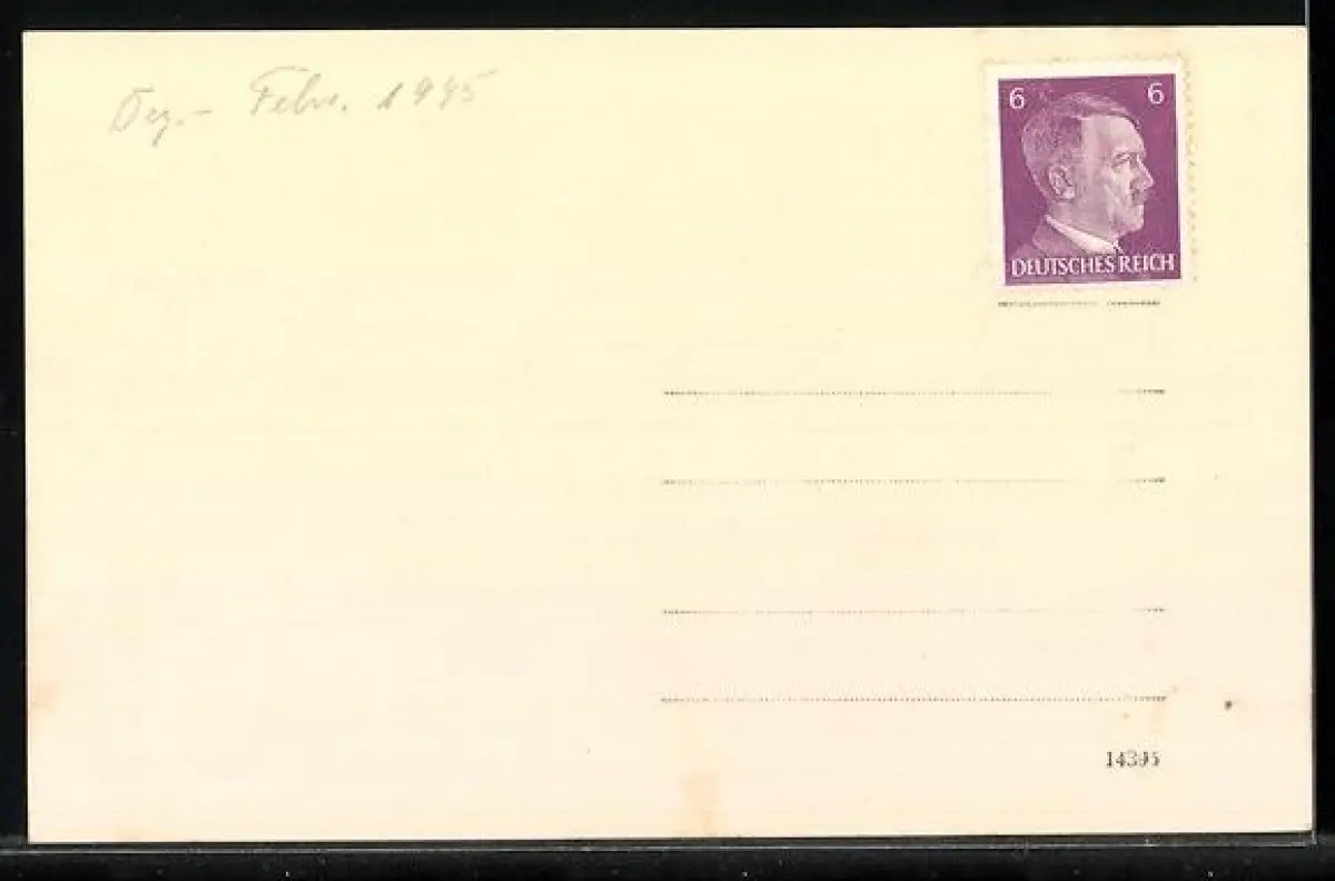 Personenbezogene Daten auf der Rückseite der Karte wurden durch blauen Textmarker unkenntlich gemacht. Die blauen Stellen sind auf die Vorderseite durchgeweicht und wirken sich negativ auf das Postkartenfoto aus