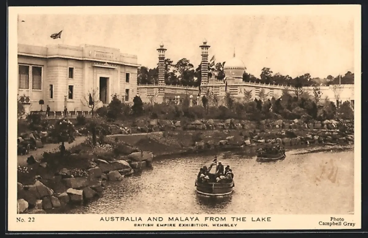 AK Wembley, British Empire Exhibition, Australia and Malaysia from the Lake, Ausstellung