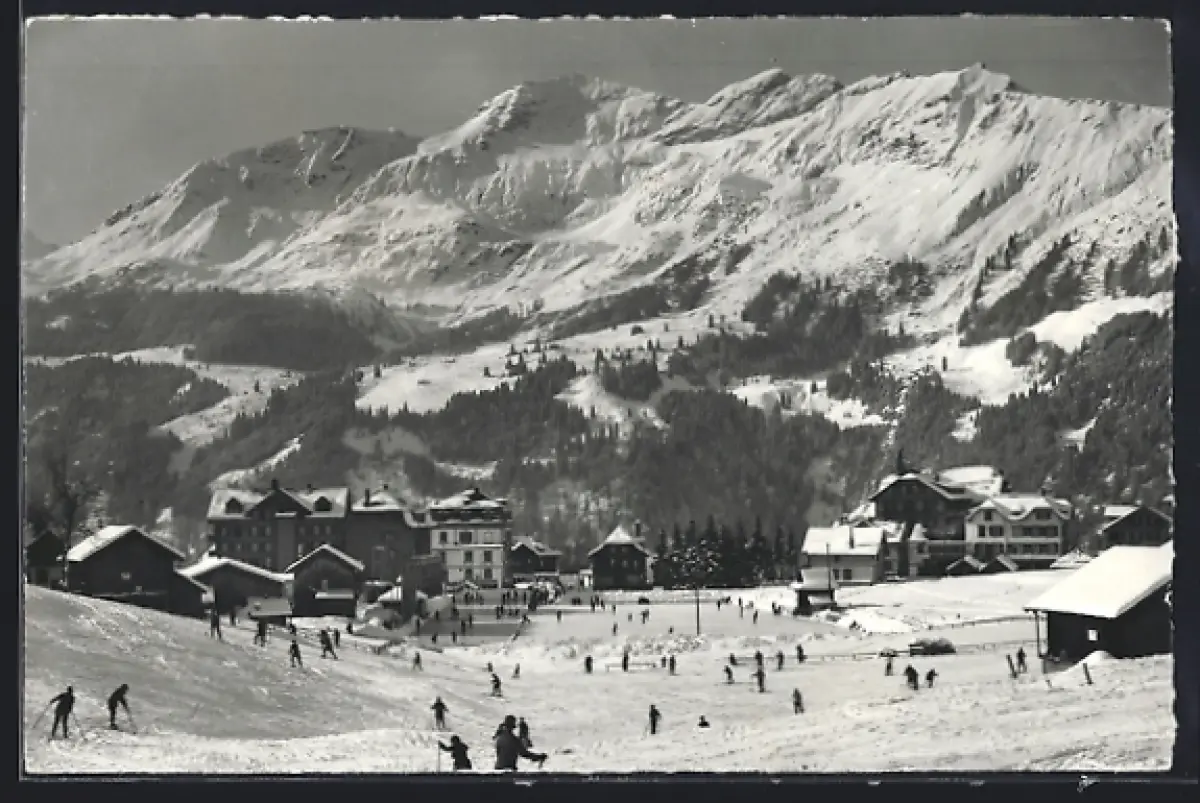 AK Wengen, Ortsansicht mit Schwarz- u. Weissbirg, Skiläufer