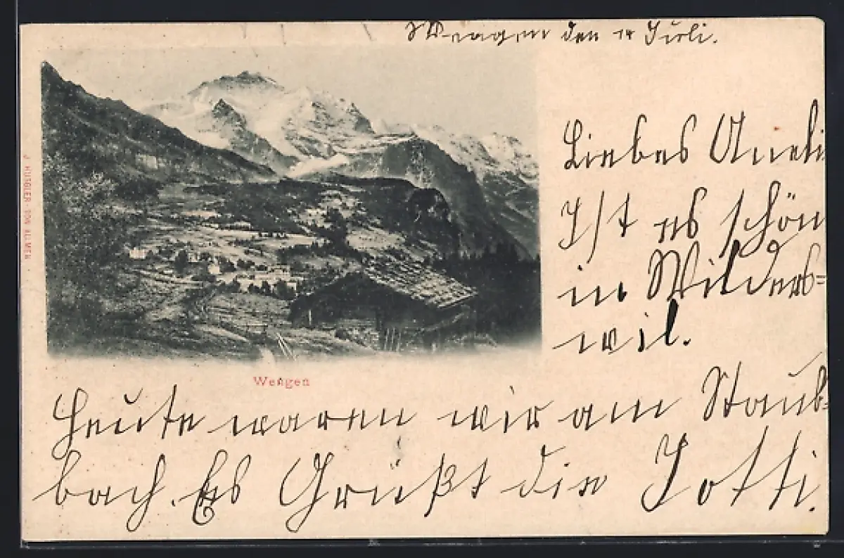 AK Wengen, Totalansicht mit Bergpanorama aus der Vogelschau