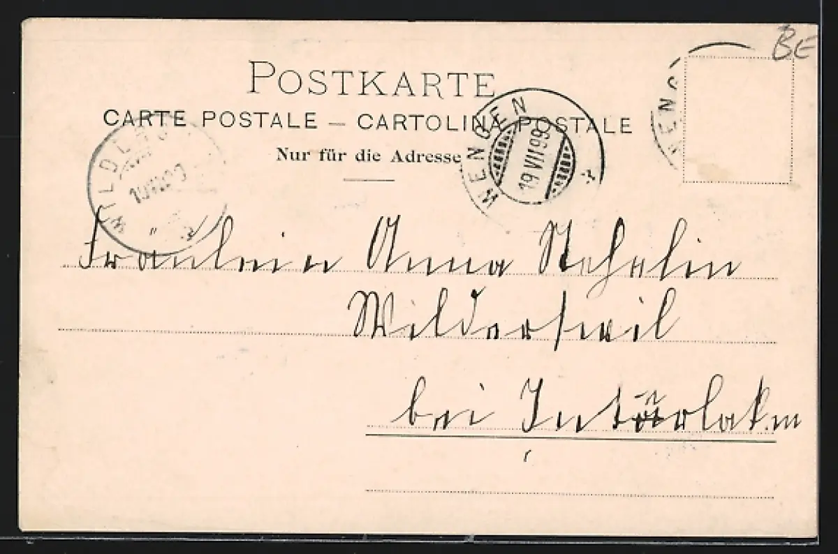 alte Ansichtskarte, gelaufen 1899, Briefmarke entfernt, rückseitig Oberflächenschaden, guter Zustand