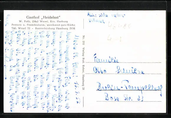 Personenbezogene Daten auf der Rückseite der Karte wurden durch blauen Textmarker unkenntlich gemacht. Die blauen Stellen sind auf die Vorderseite durchgeweicht und wirken sich negativ auf das Postkartenfoto aus