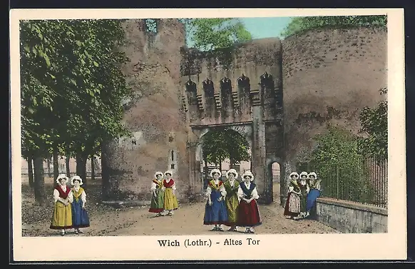 AK Wich, Frauen in elsass-lothringischer Tracht vor dem Alten Tor