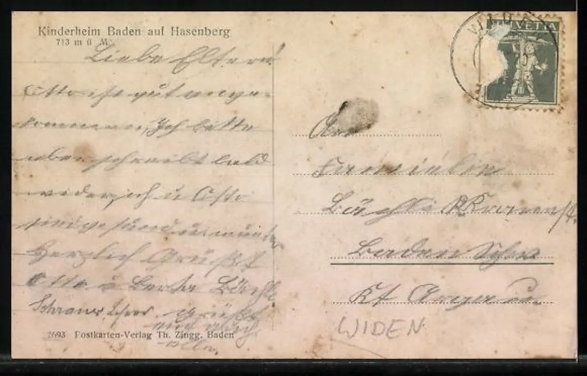 Personenbezogene Daten auf der Rückseite der Karte wurden durch blauen Textmarker unkenntlich gemacht. Die blauen Stellen sind auf die Vorderseite durchgeweicht und wirken sich negativ auf das Postkartenfoto aus