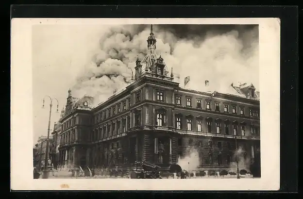 AK Wien, Brand des Justizpalastes am 15. Juli 1927, Strassenansicht des brennenden Gebäudes