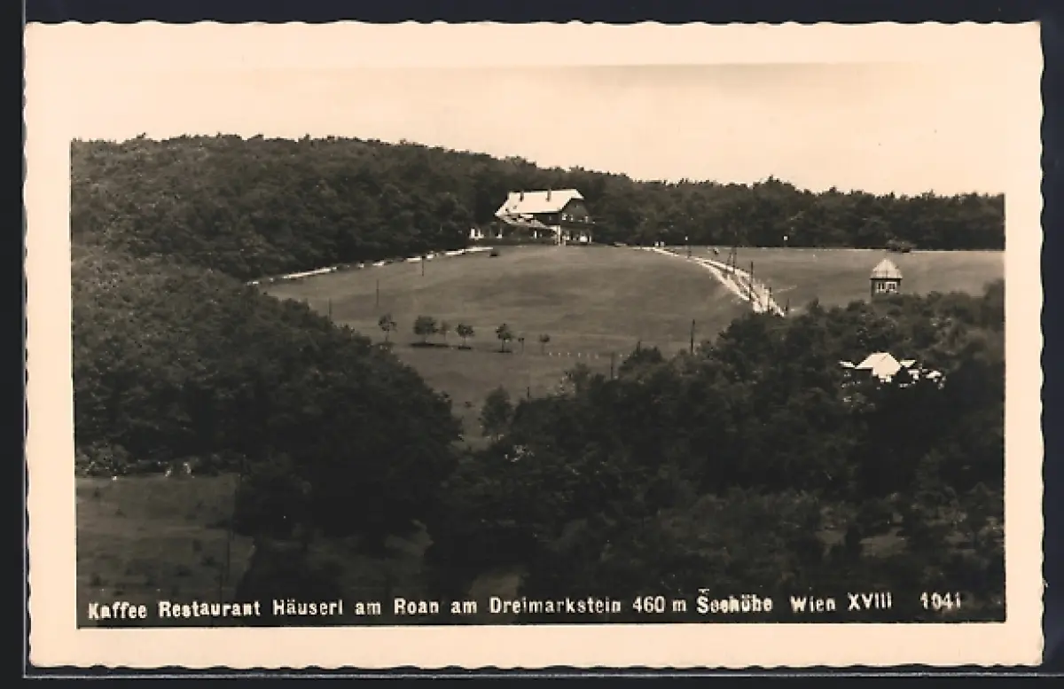 AK Wien, Dreimarkstein, Kaffee Restaurant Häuserl am Roan J. Bodenstein, Weidlingbach 58, Ansicht m. Umgebung, Turm
