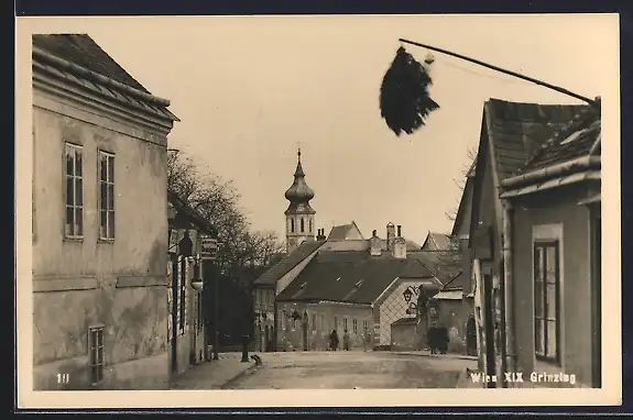 AK Wien-Grinzing, Strassenpartie mit Blick zur Kirche