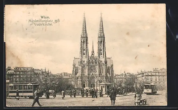 AK Wien, Maximilianplatz mit Votivkirche und Strassenbahn