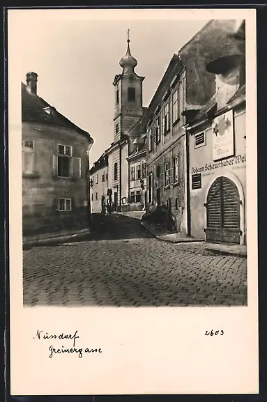 AK Wien-Nussdorf, Greinergasse mit Weinstube Johann Schauerhuber