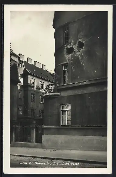 AK Wien, Simmering Braunhubergasse, Haus mit grossen Einschusslöchern