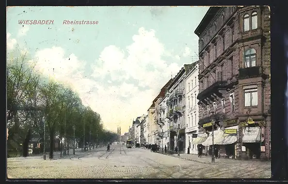 AK Wiesbaden, Rheinstrasse mit Geschäften, Strassenbahn