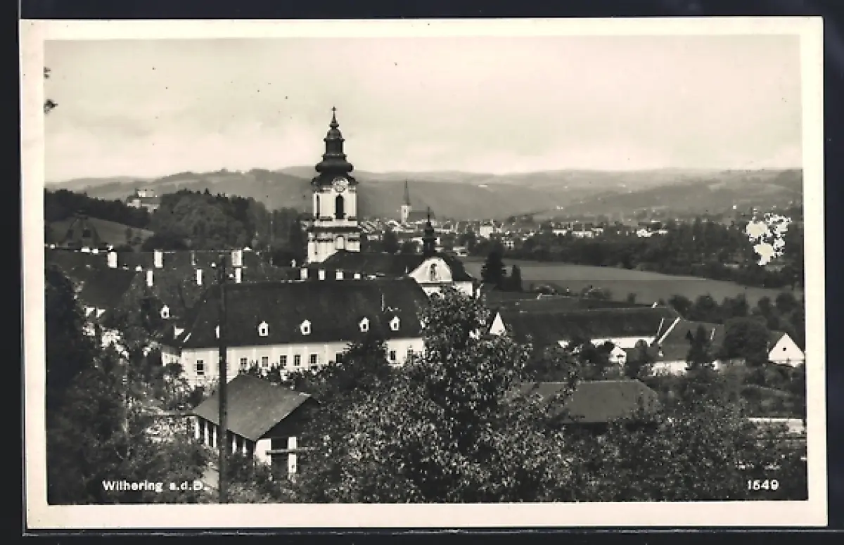 AK Wilhering, Totalansicht mit Kirchturm aus der Vogelschau