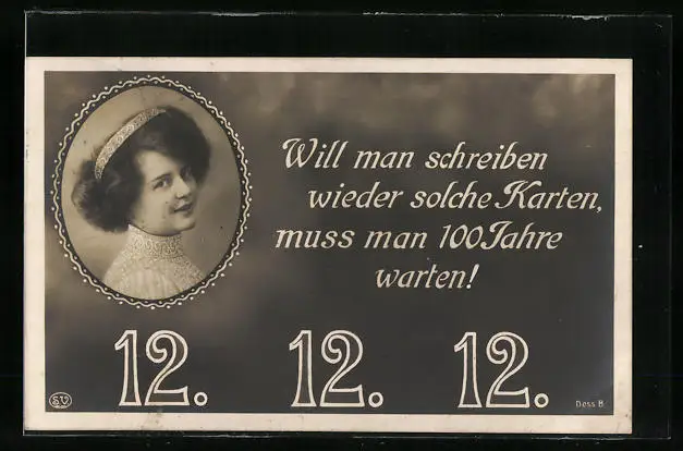 AK Will man schreiben..., 12.12.12, Frauenportrait