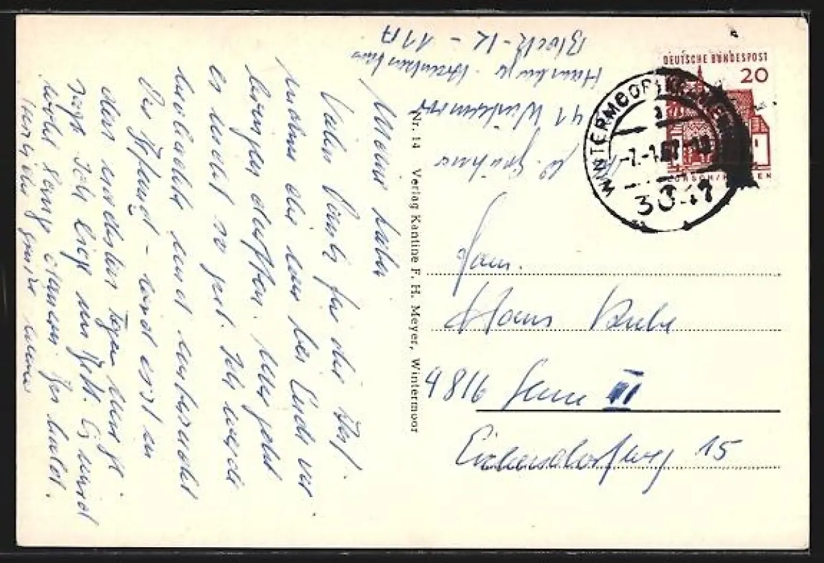 Personenbezogene Daten auf der Rückseite der Karte wurden durch blauen Textmarker unkenntlich gemacht. Die blauen Stellen sind auf die Vorderseite durchgeweicht und wirken sich negativ auf das Postkartenfoto aus
