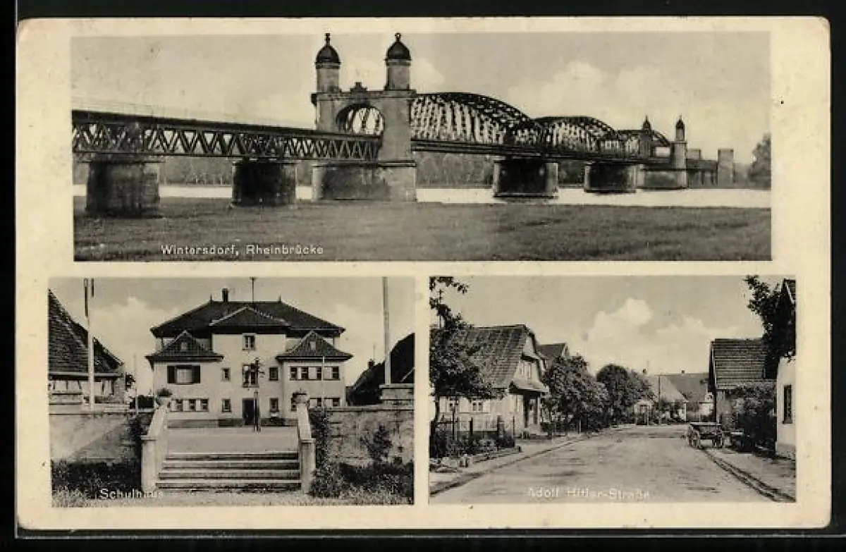 AK Wintersdorf / Rastatt, Rheinbrücke, Schulhaus, Strasse