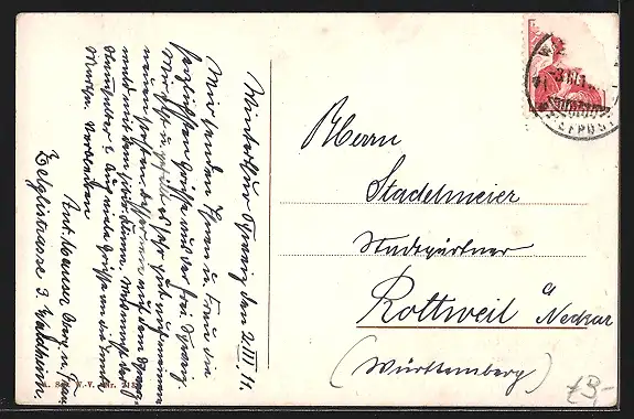 gelaufen 1911, Briefmarke entfernt, rückseitig Klebe- und Papierreste, guter Zustand