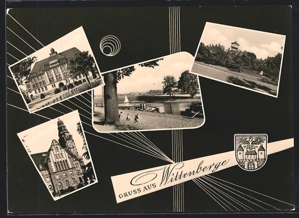 AK Wittenberge, Rathaus, Uferpartie, Turm
