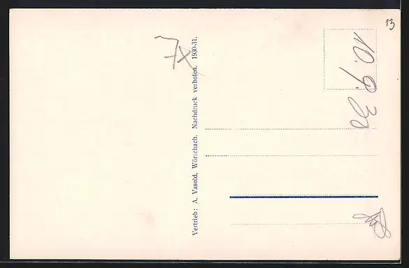 Personenbezogene Daten auf der Rückseite der Karte wurden durch blauen Textmarker unkenntlich gemacht. Die blauen Stellen sind auf die Vorderseite durchgeweicht und wirken sich negativ auf das Postkartenfoto aus