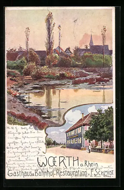 AK Wörth a. Rhein, Gasthaus & Bahnhof-Restauration v. F. Schmidt