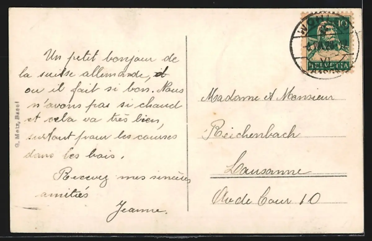 Personenbezogene Daten auf der Rückseite der Karte wurden durch blauen Textmarker unkenntlich gemacht. Die blauen Stellen sind auf die Vorderseite durchgeweicht und wirken sich negativ auf das Postkartenfoto aus