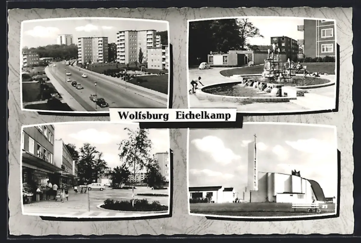 AK Wolfsburg Eichelkamp, Hochhäuser, Springbrunnen