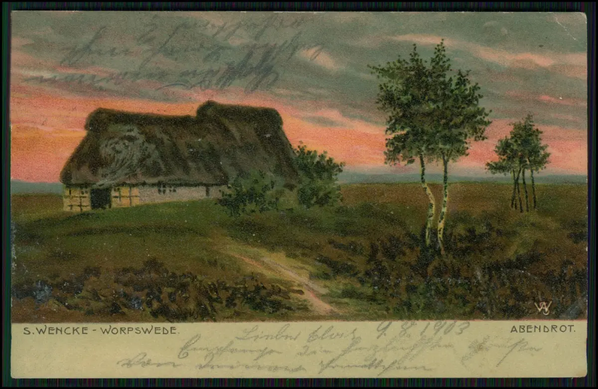 Worpswede zählt zu den bedeutenden Künstlerkolonien Deutschlands. Gegründet wurde sie Ende des 19. Jahrhunderts und wurde schnell zum Anziehungspunkt für Malerinnen und Maler, die das norddeutsche Moor und seine Atmosphäre suchten. Die hier angebotene kolorierte Karte zeigt ein typisches Moorhaus vor einem intensiven Abendrot, signiert S Wencke, einem Künstler aus dem Umfeld der Worpsweder Kunstszene. Die Kolonie ist bekannt für Landschaftsdarstellungen mit natürlichem Lichtspiel und stillen Weiten des Teufelsmoors.