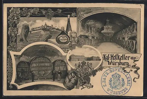 AK Würzburg, Kgl. Hofkeller, Innenansicht mit Weinfässern, Weinflaschen & Glas, Wappen
