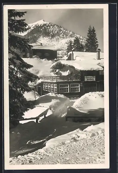AK Wurzhütte am Spitzingsee, Ansicht mit Brecherspitz im Schnee