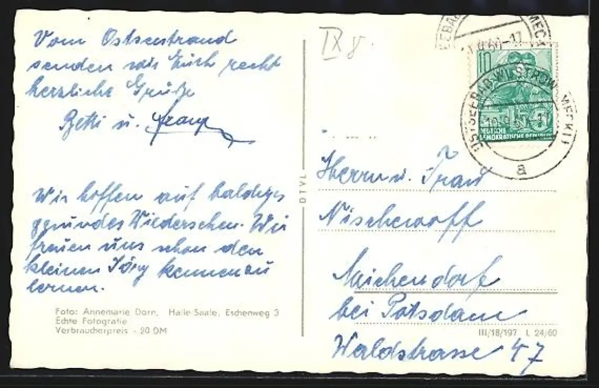 Personenbezogene Daten auf der Rückseite der Karte wurden durch blauen Textmarker unkenntlich gemacht. Die blauen Stellen sind auf die Vorderseite durchgeweicht und wirken sich negativ auf das Postkartenfoto aus
