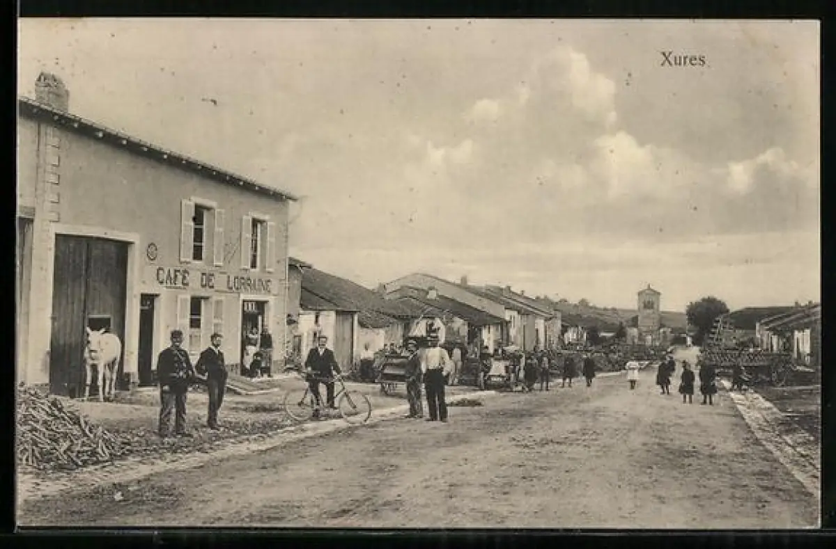 AK Xures, Rue principale avec le Café de Lorraine et villageois animés