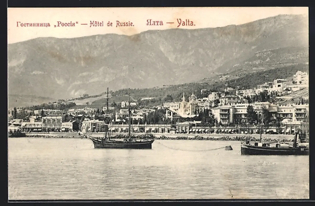 AK Yalta, Hotel de Russie, Ortspanorama mit Schiffen