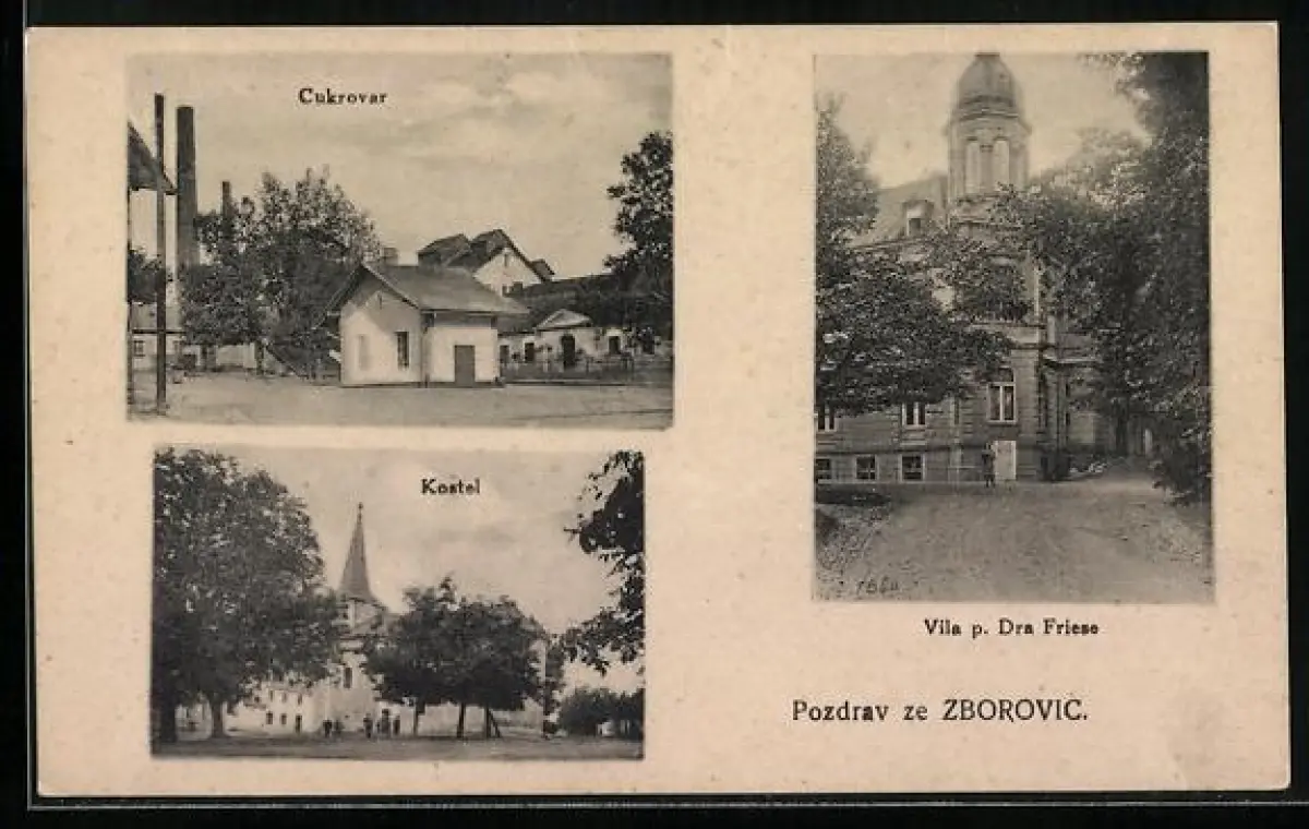 AK Zborovic, Cukrovar, Kostel, Vila p. Dra Friese