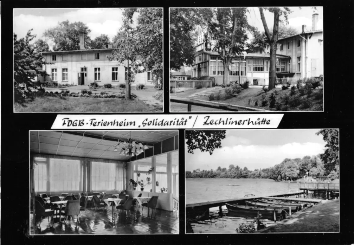 Ansichtskarte Zechlinerhütte Kr. Neuruppin FDGB-Heim "Solidarität vier Abb., gestaltet, Version 2 Erhaltung I-II postalisch gelaufen, gestempelt: Rheinsberg (Mark), 3.9.65 Druckvermerk: 1965 Herstellungsland: DDR Verlag: PGH Rotophot, Bestensee bei Berlin