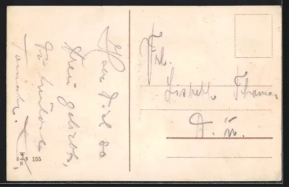 Personenbezogene Daten auf der Rückseite der Karte wurden durch blauen Textmarker unkenntlich gemacht. Die blauen Stellen sind auf die Vorderseite durchgeweicht und wirken sich negativ auf das Postkartenfoto aus