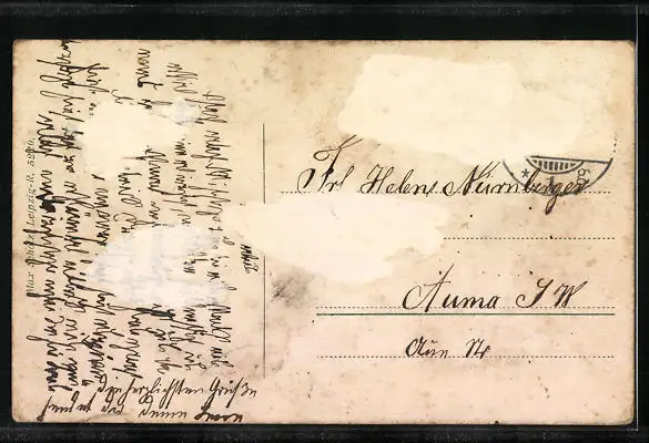alte Ansichtskarte, gelaufen, Briefmarke entfernt, rückseitig Klebe- und Papierreste, rückseitig Oberflächenschaden, Stempelspur, guter Zustand