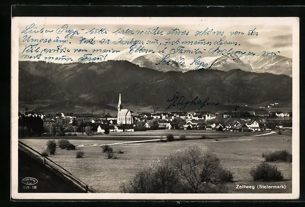 AK Zeltweg, Ortsansicht mit Gebirgspanorama