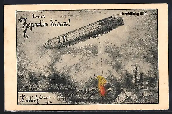 AK Zeppelin bombardiert Lüttich, 9. August 1914, 1. Weltkrieg