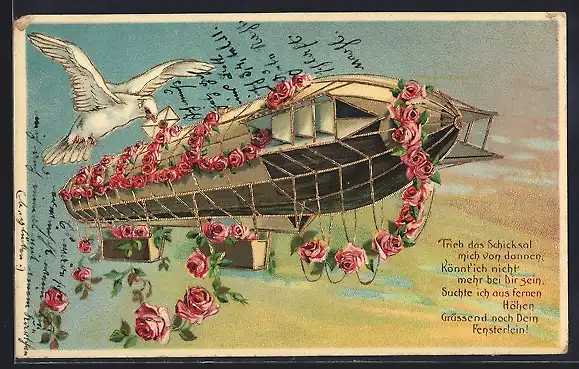 AK Zeppelin mit Blumen und Brieftaube, Glückwunsch zum Geburtstag