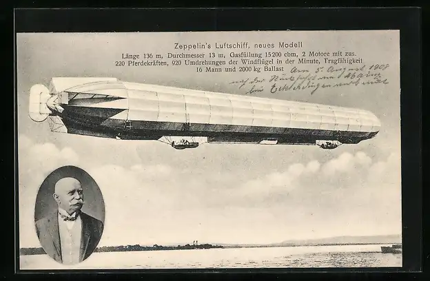AK Zeppelin`s Luftschiff mit Seepanorama, Portrait Graf Zeppelin im Anzug