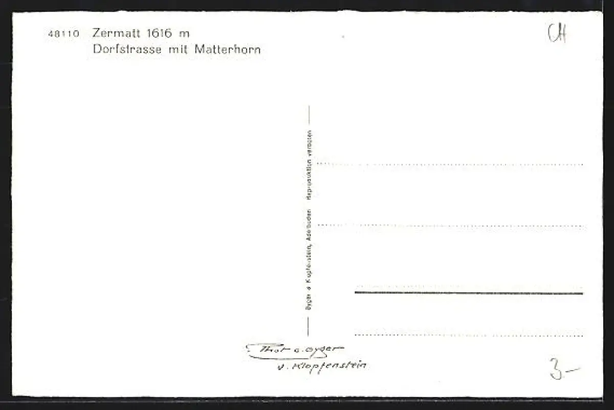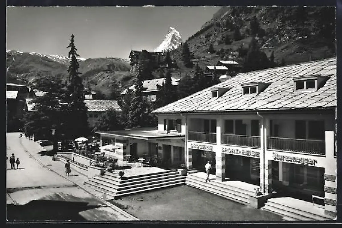 AK Zermatt, Dorfstrasse mit Drogerie Sturzenegger und Matterhorn