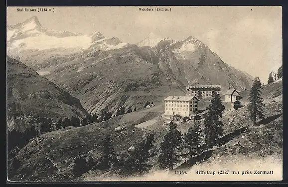 AK Zermatt, Riffelalp mit Zinal Rothorn und Weisshorn