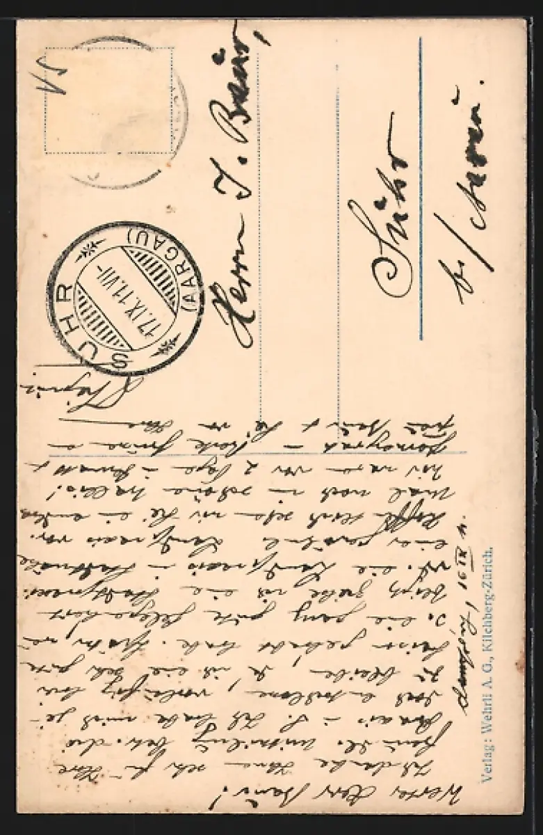 Personenbezogene Daten auf der Rückseite der Karte wurden durch blauen Textmarker unkenntlich gemacht. Die blauen Stellen sind auf die Vorderseite durchgeweicht und wirken sich negativ auf das Postkartenfoto aus