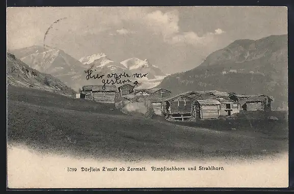 AK Zermatt, Z`mutt ob Zermatt, Ortsansicht mit Rimpfischhorn und Strahlhorn