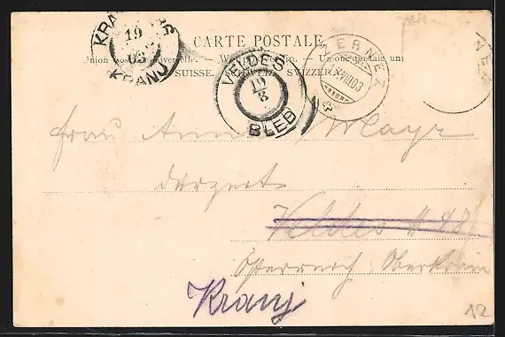 gelaufen 1903, Eckknick oben li., Briefmarke entfernt, rückseitig Oberflächenschaden, guter Zustand