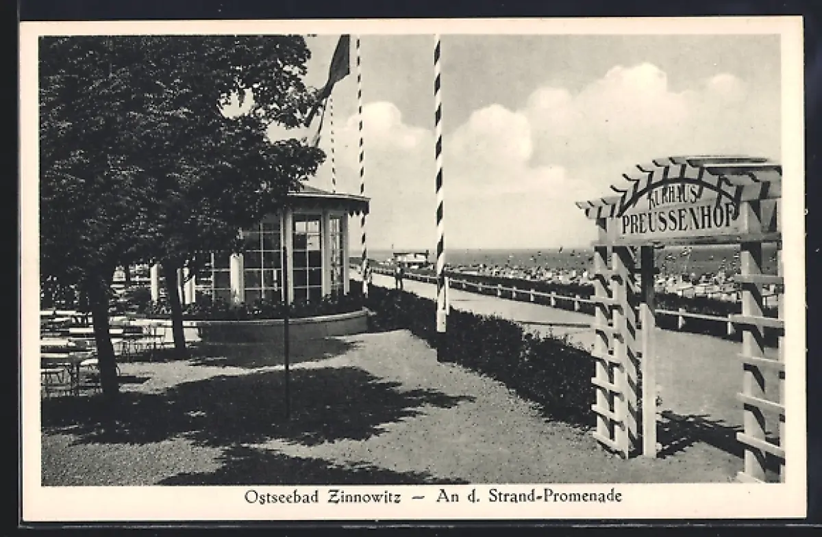 AK Zinnowitz /Ostsee, Torbogen Kurhaus Preussenhof und Strandpromenade mit Glaspavillon u. Strandblick